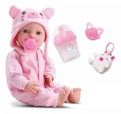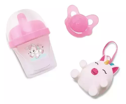 Ela possui um corpo macio e leve, facilitando o manuseio pelos pequenos. Os detalhes delicados, como o rosto sorridente e os olhos que parecem brilhar, tornam a brincadeira ainda mais especial. A boneca também é acompanhada de acessórios lindos como o chaveirinho de unicórnio, chupeta e mamadeira mágica, incentivando a imaginação e o cuidado