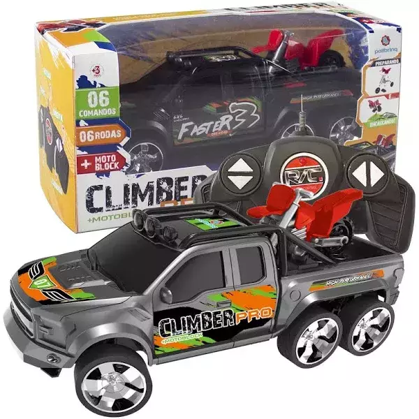 Climber Pro +MotoBlock com controle remoto - Polibrinq Uma Super Caminhonete Linda e Divertida de controle remoto, acompanhada de uma Moto Block de encaixar. A Moto Block é desmontável, com ela a criança monta e desmonta, se divertindo muito, a caminhonete possui 6 rodas e 6 comandos. A Picape controle remoto Climber Pró ainda conta com 2 Rodas na frente e 4 rodas atrás, possibilitando uma maior tração e arranque para enfrentar os mais diversos obstáculos, e além disso tudo , ainda vem com uma MotoBlock na carroceria, para você montar e encaixar na carroceria da Picape. Controle remoto com 6 funções: - Frente Direita - Frente Esquerda - Ré Direita - Ré Esquerda - Frente - Ré A Picape Climber Pró controle remoto funciona: - 4 pilhas de 1,5 V AA - não inclusas (carrinho) - 2 pilhas de 1,5 V AA - não inclusas (controle remoto) Não recomendável para menores de 03 anos, por conter partes pequenas, que podem ser engolidas Dimensões e Peso do Climper Pro +MotoBlock com controle remoto - Polibrinq - Dimensões do Carrinho: 23cm x 8cm x 9cm (CxLxA) - Dimensões da Embalagem: 25cm x 10,5cm x 13cm (CxLxA) - Peso do Carrinho: 350 Kg Imagens meramente ilustrativas, os produtos, cores e gráficos podem diferir dos apresentados.
