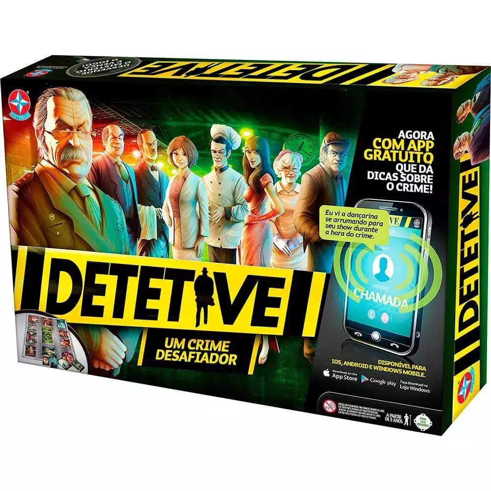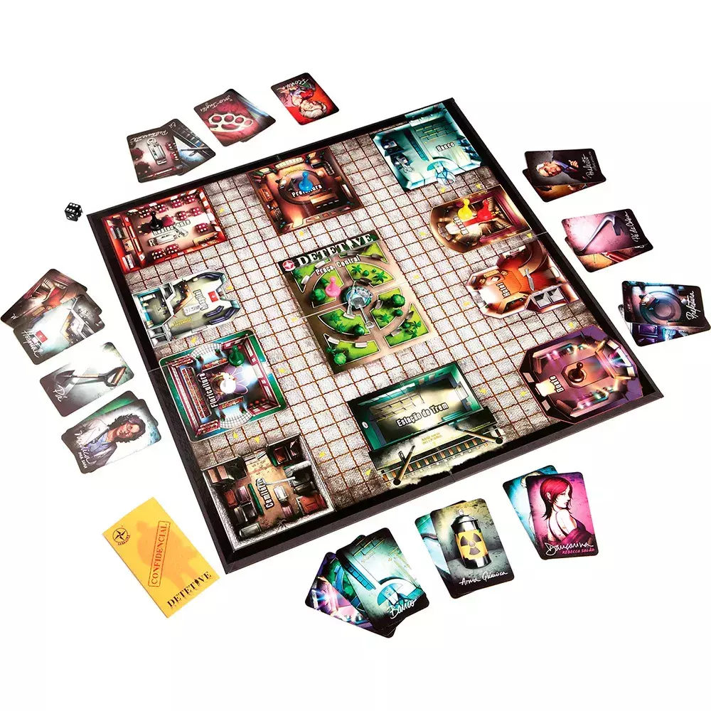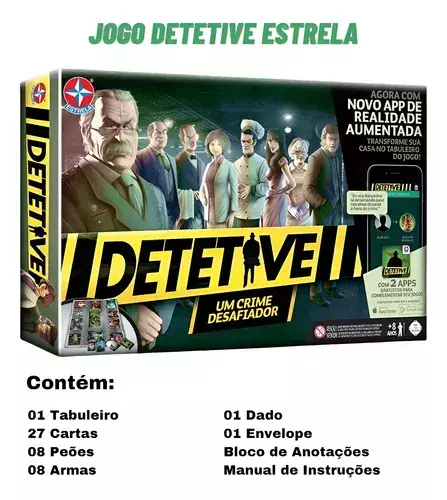 Contém na Embalagem 1 tabuleiro, 27 cartas, 8 peões, 8 armas, 1 dado, 1 envelope, 1 bloco de anotações e 1 manual de instruções.