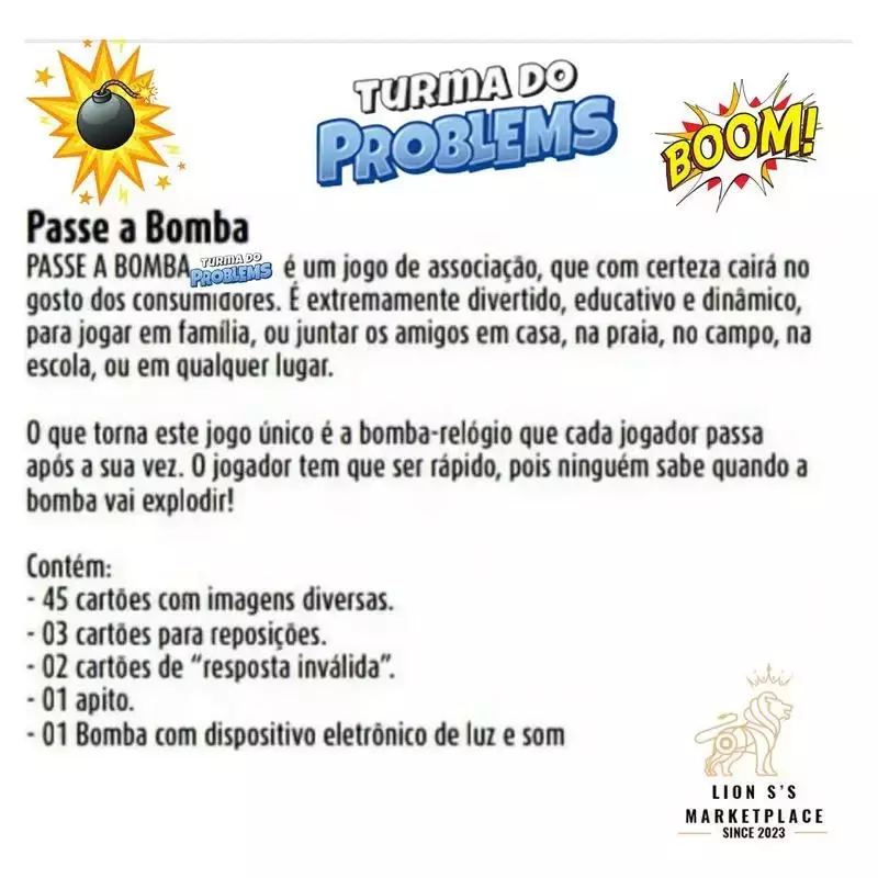 "Passe a Bomba: Turma do Problems" é um jogo de festa divertido e frenético que testa a rapidez de raciocínio e a capacidade de comunicação dos jogadores. Nele, os participantes se reúnem em equipes e tentam passar uma "bomba" virtual para frente antes que ela exploda.Cada rodada tem um tema específico, como "profissões", "animais", "lugares", entre outros. Um jogador começa segurando a "bomba" e tem que descrever uma palavra relacionada ao tema da rodada para que os outros adivinhem. No entanto, há uma pegadinha: a palavra não pode conter uma letra específica, como a letra "A" ou a letra "S", por exemplo.