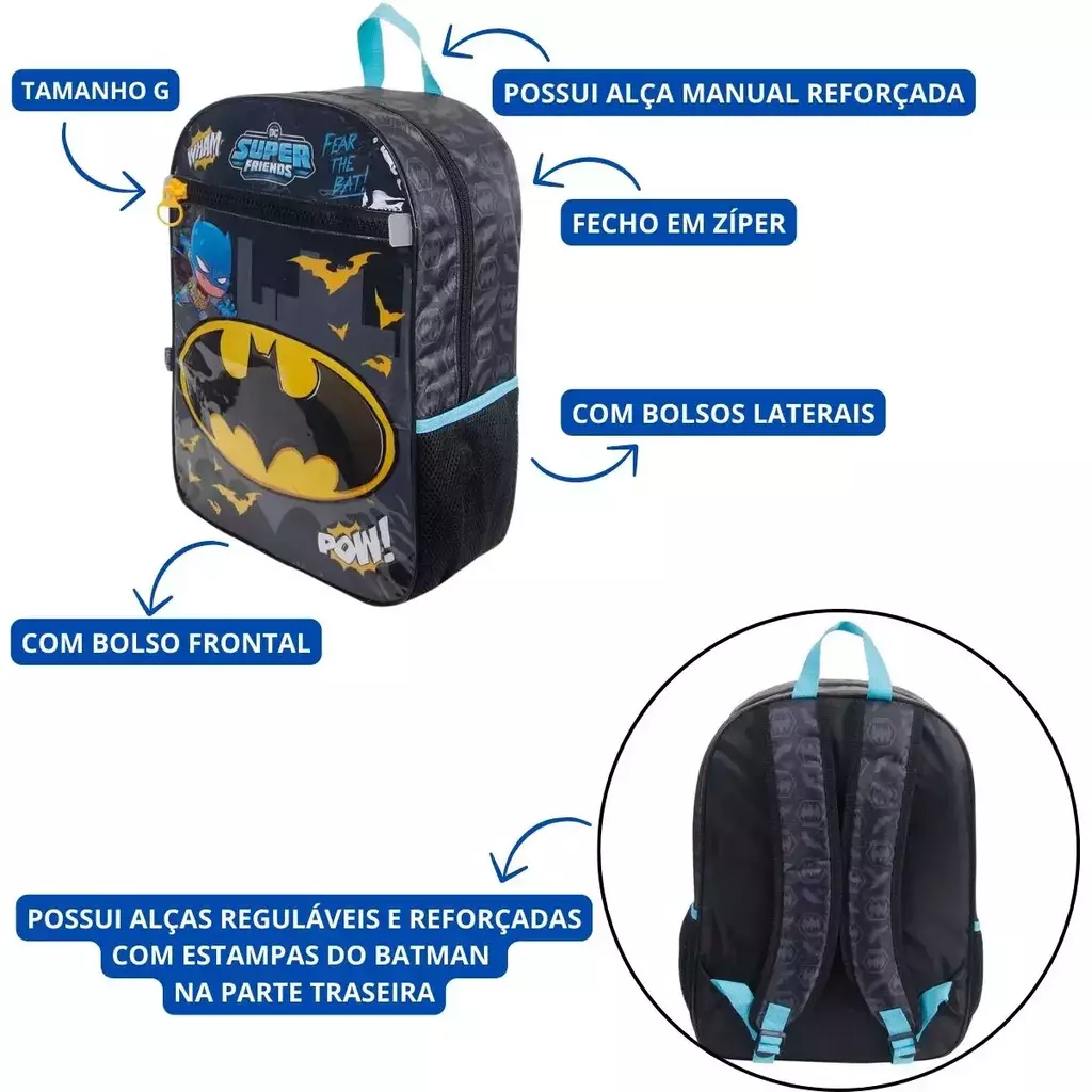 A Mochila Escolar G Infantil Menino Batman DC Super Friends é uma excelente opção para crianças que adoram o universo do Batman. Com um design inspirado no herói de Gotham, ela combina estilo e funcionalidade para o dia a dia escolar.