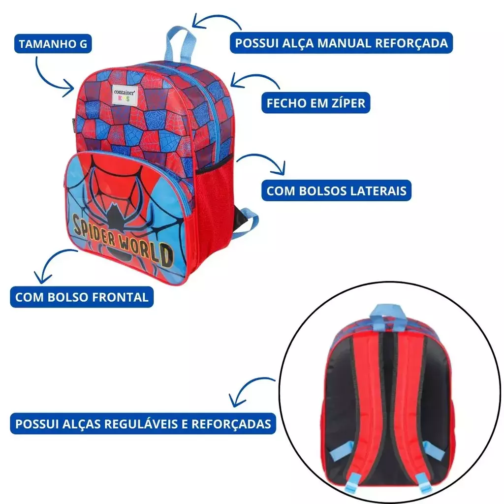 A Mochila Escolar G Infantil Menino Spider World é uma opção incrível para crianças que adoram o universo dos super-heróis, especialmente o Homem-Aranha. Com um design vibrante e estampas inspiradas no mundo aracnídeo, ela combina estilo e funcionalidade para o dia a dia escolar.
