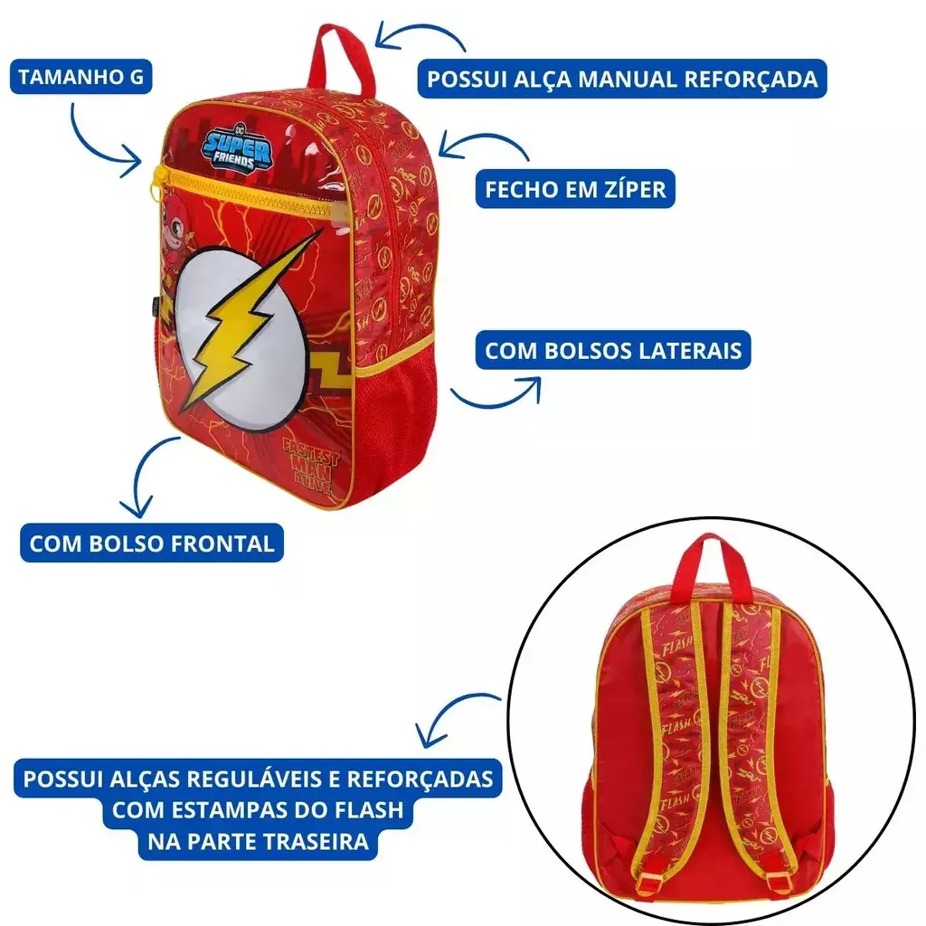A Mochila Escolar G Infantil Menino The Flash DC Super Friends é uma excelente opção para crianças que adoram o universo do Flash. Com um design vibrante inspirado no velocista escarlate, ela combina estilo e funcionalidade para o dia a dia escolar.