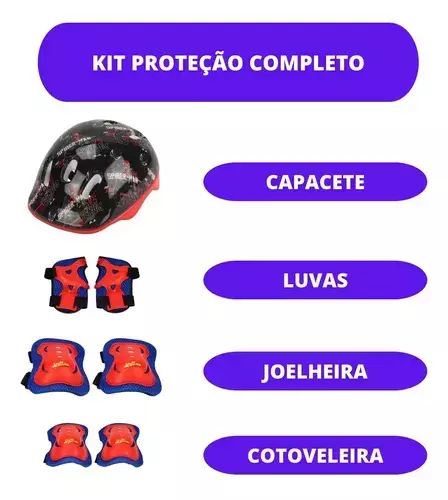 O kit de proteção completo inclui capacete, cotoveleira, joelheira e munhequeira, proporcionando a proteção necessária para que os patinadores possam patinar com segurança.