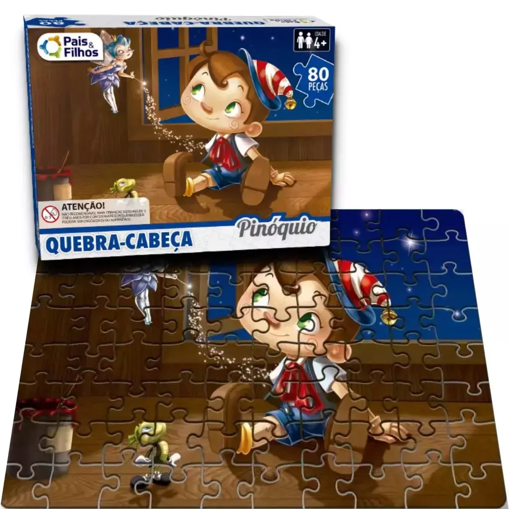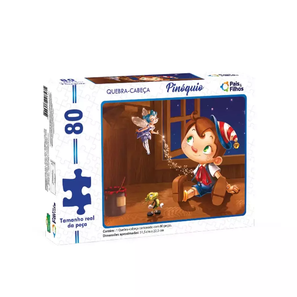 Produzido com material de qualidade, este quebra cabeça com 80 peças apresenta a Pinóquio e os personagens da famosa história infantil. As peças são fáceis de encaixar e colaboram para que a criança desenvolva a coordenação motora, percepção visual e noção de espaço.