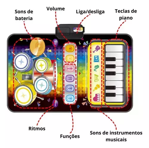 Sensível ao toque: As crianças podem tocar no tapete e produzir sons realistas de instrumentos e batidas de bateria