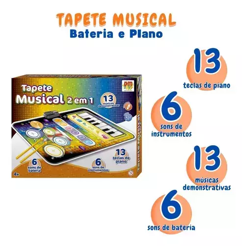 O Tapete Musical 2 em 1 – DM Toys é a escolha perfeita para estimular o desenvolvimento musical e motor de crianças a partir de 4 anos. Com um design interativo e educativo, ele oferece duas formas de diversão: como piano e como bateria, proporcionando uma experiência única de aprendizado enquanto a criança se diverte!